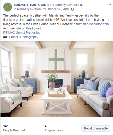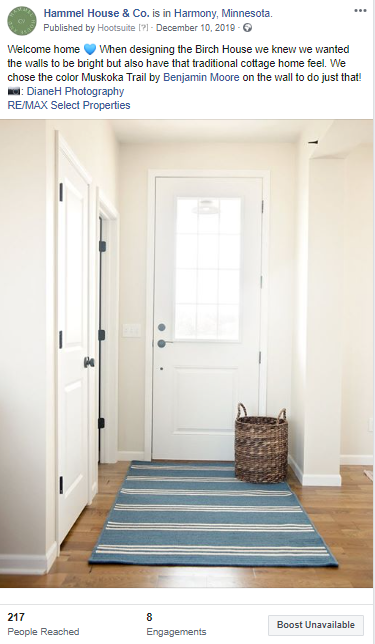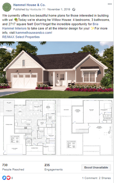 I took the responsibility to develop a social strategy for Bria Hammel Interiors' sister company Hammel House & Co. At the time, Hammel House & Co did not have an active presence on Facebook or Instagram, and they needed to generate awareness for a development property that had been on the market for a while.