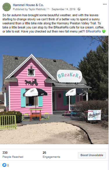 I crafted a strategy for Facebook that aimed to create awareness by sharing events and showcasing the charming small town of Harmony, Minnesota where the property was located. Additionally, I created targeted advertisements to promote the property itself.